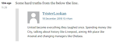 "맨유는 이제 그들이 한때 비웃었던 모든 클럽들처럼 되었다. 맨시티처럼 돈을 써대고 리버풀처럼 과거 업적만을 이야기하며 아스날처럼 4위를 목표로 하고 첼시처럼 감독을 바꿔댄다."
