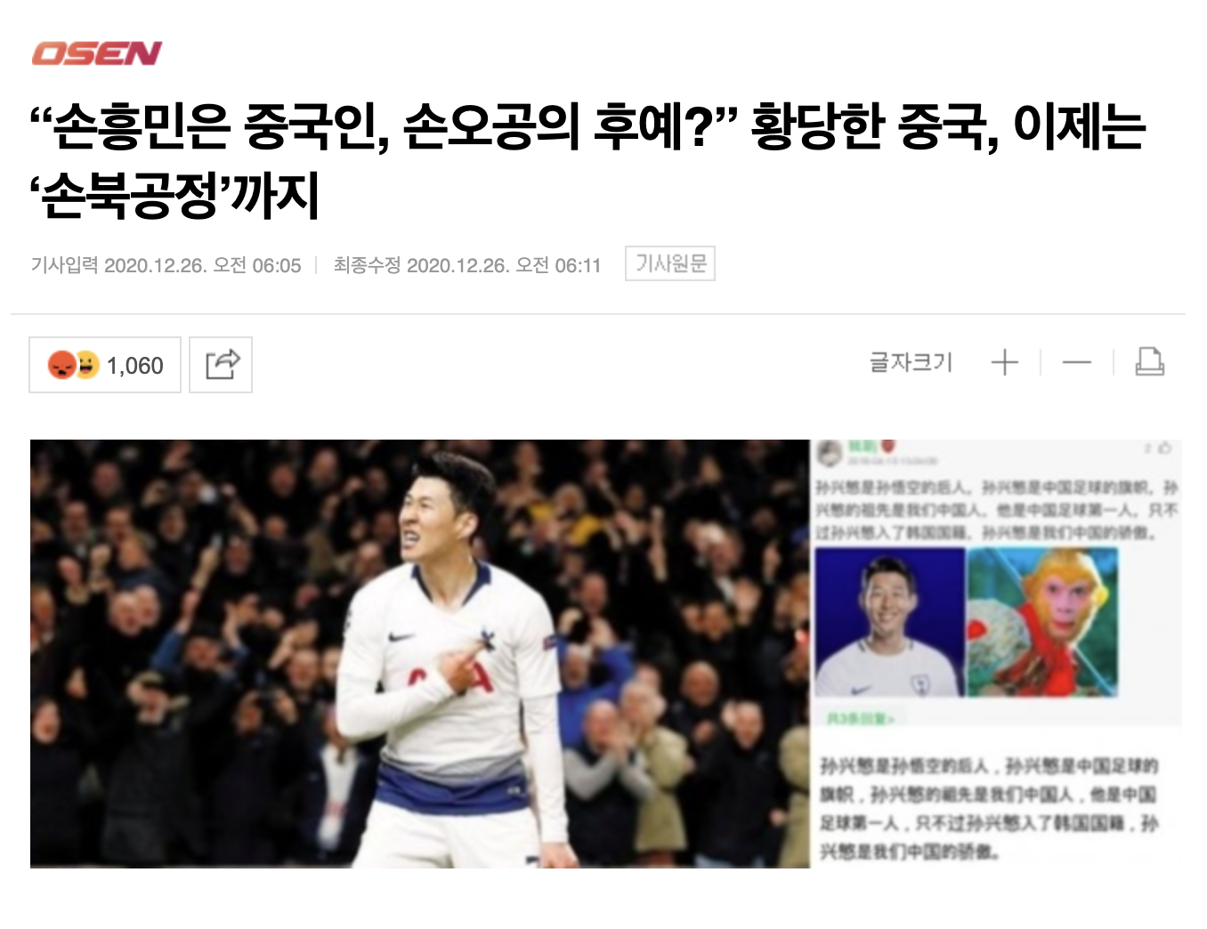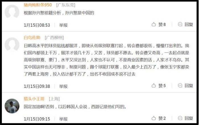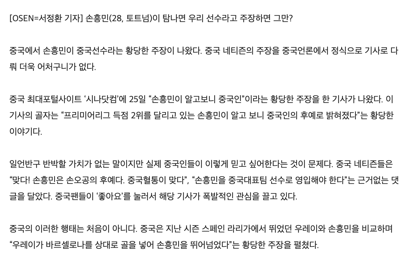 중국 최대의 포털 사이트 중 하나인 시나닷컴에는 손흥민의 최근 활약을 칭찬하는 기사가 게재됐다. 그런데 해당 기사 댓글에서 한 중국 축구 팬은 "손흥민의 가계도를 분석하니 그가 순수 중국인이었다는 게 밝혀졌다"고 주장했다.