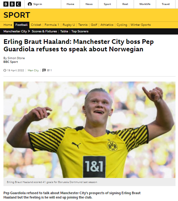 [[BBC] 홀란드가 시티로 이적할 것이라는 느낌이 있다.]
