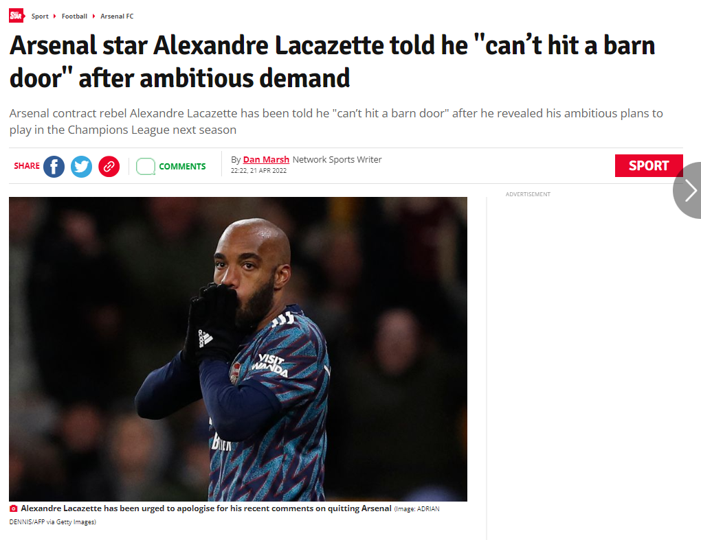 출처 : https://www.dailystar.co.uk/sport/football/arsenal-lacazette-transfer-insult-apology-26768787