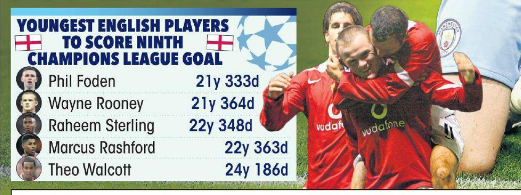 루니를 제치고 영국 선수중 챔스에서 9골을 넣은 가장 어린 선수 등극 ㄷㄷ.......딱 한달 차이...